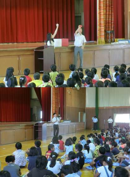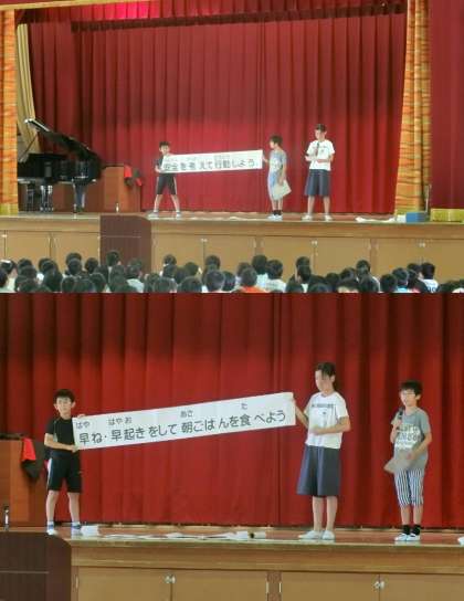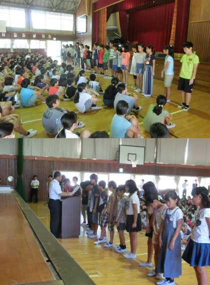 陸上部選手へのがんばり賞授与、保健目標の発表、紅白決め、生徒指導の先生からの話のようすです。