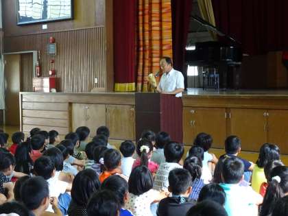 おはようございます。42日間と長いと思っていた夏休みは、あっという間に終わってしまいました。季節も、セミの鳴き声が大きかった夏から、夜に虫の鳴き声が聞こえる秋に変わってきました。大きなけがや事故もなく、元気なみんなと会うことができて、たいへんうれしいです。