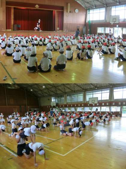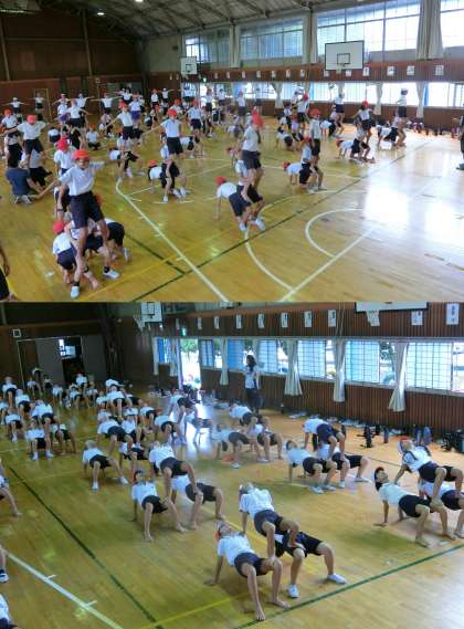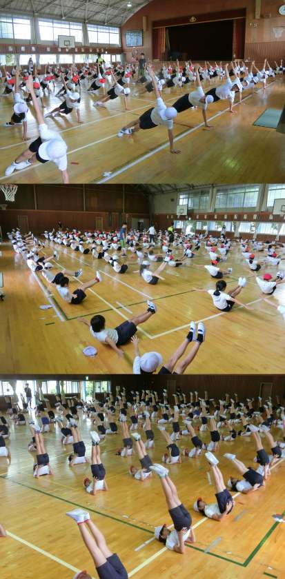 運動会練習 5・6年生 公開日 2017/09/05 更新日 2017/09/05 5年生 9月5日(火)、5・6年生の運動会練習のようすです。体育館ではじめて組立体操の練習に取り組みました。今日は、一人演技と3人組の演技を練習しました。