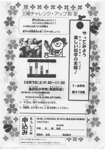 第4回の土曜チャレンジアップ教室が、10月7日(土)に開かれます。今回は、全学年を対象とした『やってみよう 楽しい科学の実験』です。サイエンスβのみなさんが、いろいろな器具を使って楽しい実験をします。参加を希望される方は、配布文書にある「申し込み」欄に必要事項を記入して、担任までご提出ください。