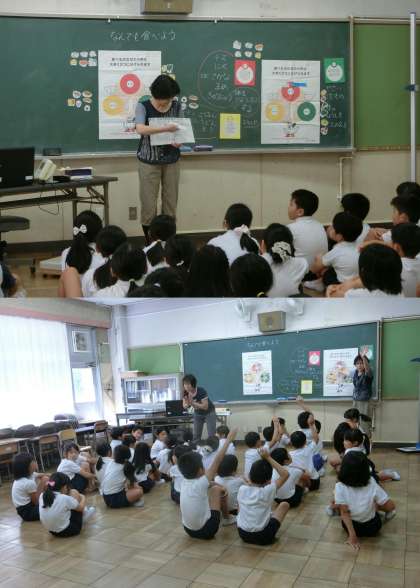9月8日(金)、3年生が発育測定をしました。測定の前に、「なんでも食べよう」をテーマに、ふだん食べている食物を3つのはらきに分けました。そして、今日の給食献立に使われている食材を3つのはたらきに分類しました。