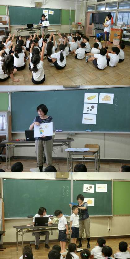 9月8日(金)、1年生の保健指導と発育測定のようすです。測定の前に、保健室の先生から「うんこ」の大切さについて話を聞きました。