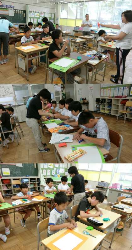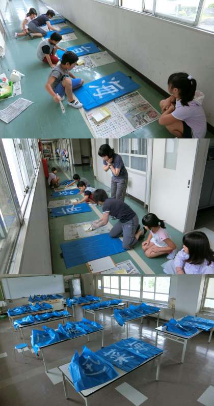 9月11日(月)、3年生の図画工作と、かえで・もみじ・いちょう学級の生活単元授業のようすです。3年生は、運動会の「どっこいせ」で身につけるはっぴの背中に、自分の名前から1文字を選んで描いていました。かえで・もみじ・いちょう学級は、敬老の日にお年寄りの方に渡すカード作りに取り組んでいました。