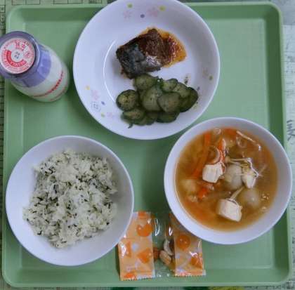 9月15日(金)、今日の給食献立は、「わかめごはん・牛乳・豆腐汁・宗田かつおのおかか煮・きゅうりのゆかりあえ・ミックスナッツ」でした。