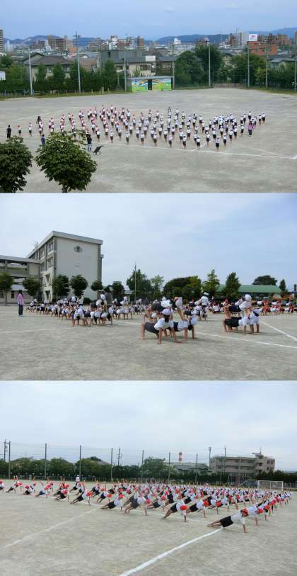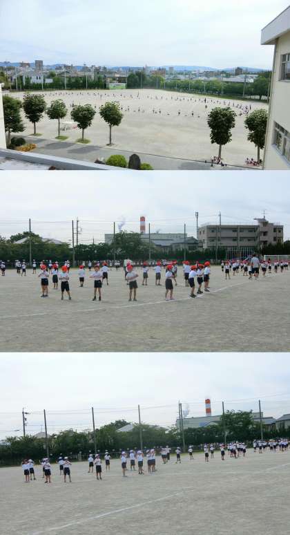 9月15日(金)、1・2年生、3・4年生、5・6年生の運動会練習と、かえで・もみじ・いちょう学級の運動会の歌「ゴーゴーゴー」の練習のようすです。5・6年生は、運動場で組立体操の練習が始まりました。