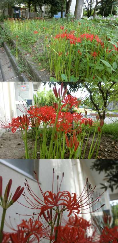 今年も校内に「ヒガンバナ(彼岸花)」が咲き始めました。9月15日(金)、中庭と北館昇降口前のヒガンバナのようすです。
