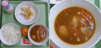 9月21日(木)、今日の給食献立は、「ごはん・牛乳・『とうがんのカレースープ』・コロコロポテトサラダ・小袋たまごなしマヨネーズ・冷凍みかん」でした。