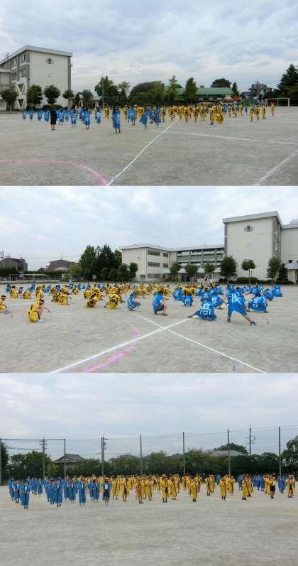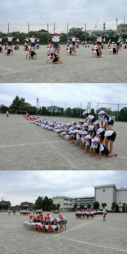 9月22日 運動会に向けて 公開日 2017/09/22 更新日 2017/09/22 4年生 9月22日(金)、1・2年生、3・4年生、5・6年生の運動会練習のようすです。1・2年生は、はじめに体育館で玉入れの隊形を練習してから、運動場でポンポンを初めて身に付けて練習しました。3・4年生は、はっぴを着て運動場で練習しました。4年生は黄色、3年生は青色のはっぴで、背中には名前の一文字が描かれています。5・6年生は、組立体操を入場から退場まで通して練習しました。