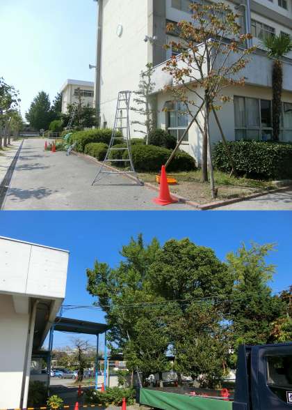 9月26日(火)、今日は、校舎前と渡りにかかるイチョウの枝の剪定をしました。