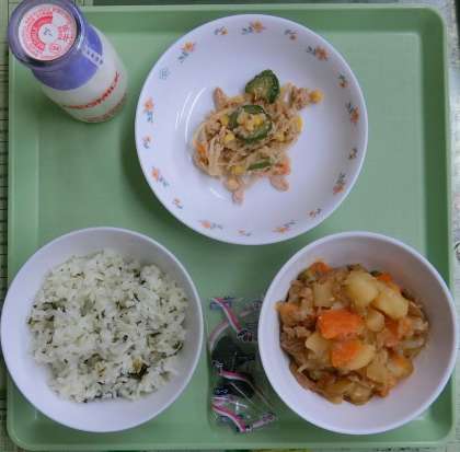 9月26日(火)、今日の給食献立は、「わかめごはん・牛乳・肉じゃが・切り干し大根とツナのサラダ・プルーン」でした。