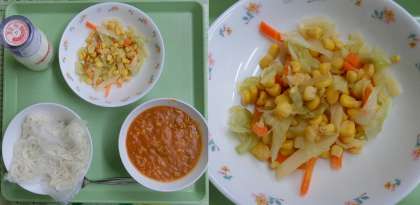 9月28日(木)、今日の給食献立は、「ソフトめん・牛乳・ミートソース・『コーンサラダ』」でした。