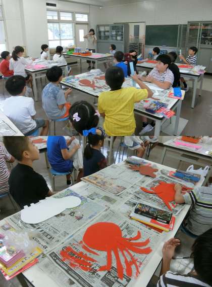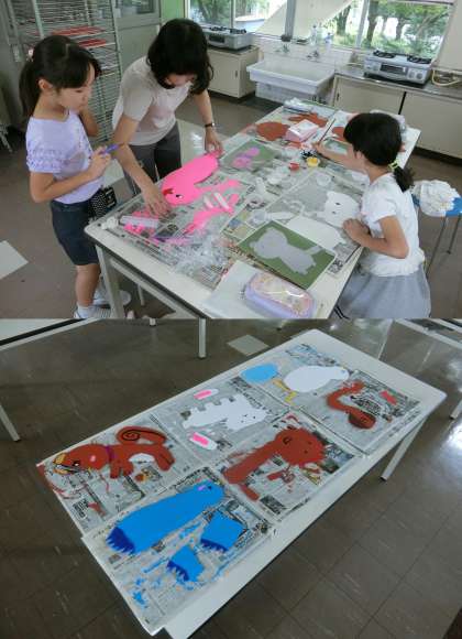 9月28日(木)、3年生が、野外造形展に出品する作品作りに取り組んでいました。10月21・22日の春日井まつりに合わせて、中央公園で野外造形展が行われます。動物や魚を、プラスチック板に色を塗って作ります。どんな作品ができるか楽しみです。