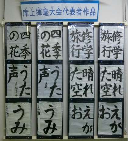 10月28日(土)に小野小学校で開催される「県下席上揮毫大会」に向けて、代表児童が練習をしています。校内の掲示板には、練習作品が掲示されています。大会をめざして練習に励んでください。