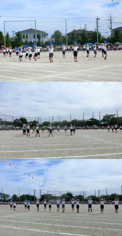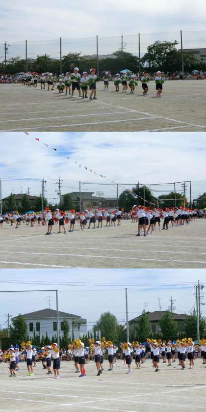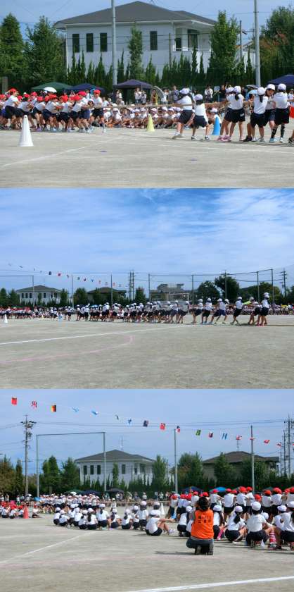 1・2年生音遊「恋ダンス」、3・4年生「綱引き−力を合わせて、ひっぱろう−」のようすです。