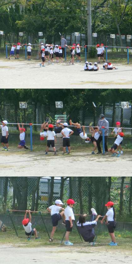 10月4日(水)、2年生の体育、4年生の理科授業のようすです。2年生は、鉄棒に取り組んでいました。4年生は「とじこめた空気と水」の単元で、とじこめた空気を押すと体積が変わるかどうかを確かめていました。