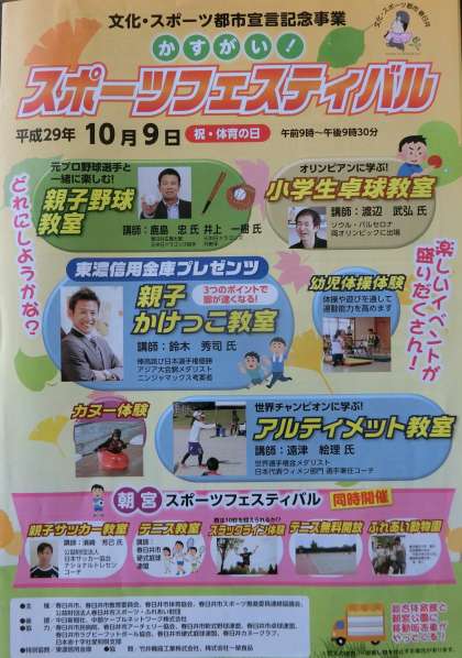 明日10月9日は、体育の日です。春日井市では、幼児から高齢者まで幅広い年齢層の人がいろいろなスポーツを楽しめる、体育の日にふさわしいスポーツ体感デーとして、『かすがい!スポーツフェスティバル』が開催されます。総合体育館、サンフロッグ春日井、市民球場、落合公園体育館、朝宮公園を会場に、文化・スポーツ都市宣言記念事業と