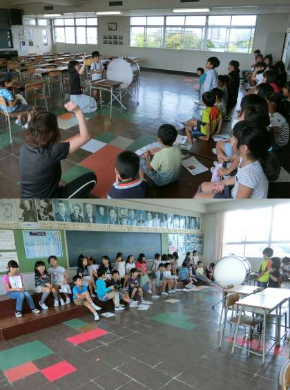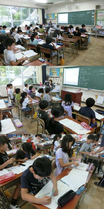 10月12日(木)、2年生の音楽、3年生の算数と理科授業のようすです。2年生は、音楽室で、自分が考えたリズム打ちの発表会をしていました。3年生の算数は、コンパスを使って二等辺三角形を書いていました。理科は、日なたと日陰の温度を調べていました。