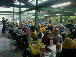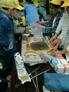 野外炊飯場で、昼食の準備が始まりました。ホットドッグをつくります。まずは、自分たちで火を起こしました。