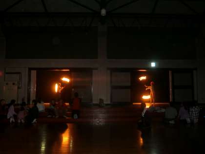野外学習11 キャンプファイヤー、その3 公開日 2017/10/16 更新日 2017/10/16 5年生 一生懸命練習してきたトーチトワリングです。雨のため、プレイホールで2つのグループに分かれて行いました。とても上手に美しくできました。