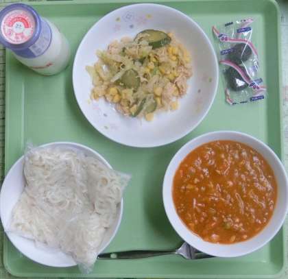10月20日(金)、今日の給食献立は、「『ソフトめん』・牛乳・ミートソース・チキンのサラダ・プルーン」でした。