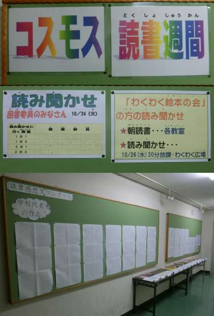 明日10月24日(火)から、『 コスモス読書週間 』 が始まります。11月2日(木)まで、朝読書に取り組みます。児童のみなさんは、家の本を持ってきたり図書室の本を借りたりして、朝読書の用意をしてください。読書期間中には、先生のすすめる本と読書感想文優秀作品の紹介、図書委員による読み聞かせを行います。