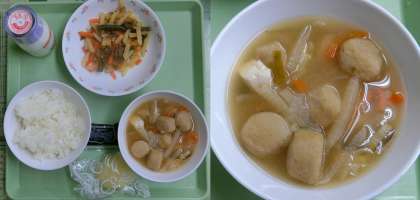 10月24日(火)、今日の給食献立は、「ごはん・牛乳・『つみれ汁』・牛肉とじゃがいものきんぴら・のり佃煮」でした。