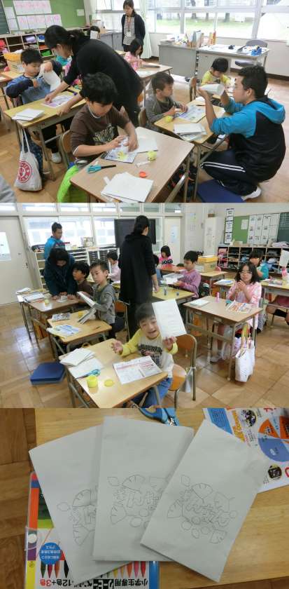 10月24日(火)、2年生の生活科、かえで・もみじ・いちょう学級の生活単元授業のようすです。2年生は、30日(月)に行う「秋まつり」の会場づくりの計画を立てていました。かえで・もみじ・いちょう学級は、ぎんなんをプレゼントするふくろを作っていました。