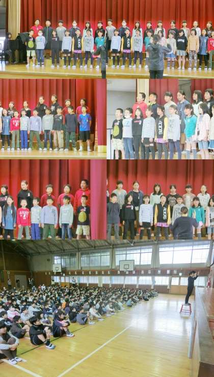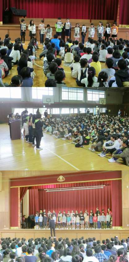10月25日(水)、朝会で、県下席上揮毫大会の代表選手と小学校音楽会に出場する4年1組の激励会を行いました。28日(土)の席上揮毫大会には、各学年から2名の代表が参加します。4年1組は、明日26日(木)の音楽会で発表する2曲『夢の世界』『生きてこそ』を、美しい声で発表しました。席上揮毫大会代表のみなさん、音楽会に出場するみなさん、これまでの練習の成果を精一杯発揮してください。