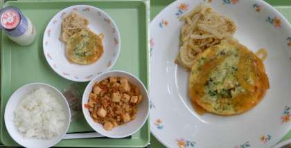 10月26日(木)、今日の給食献立は、「ごはん・牛乳・マーボ豆腐・『フーヨーハイのたれかけ』・もやしのナムル・ココアパウダー」でした。