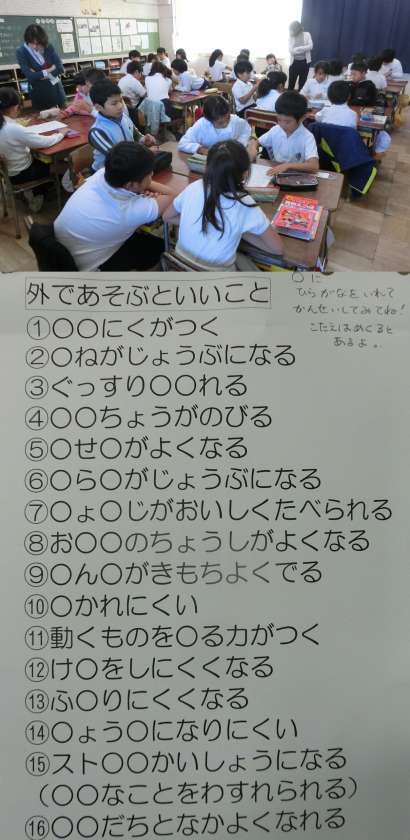 11月1日(水)、3年生が発育測定をしました。測定の前に、「外で遊ぶといいこと」について考えました。写真は、発育測定前の話し合いのようすです。