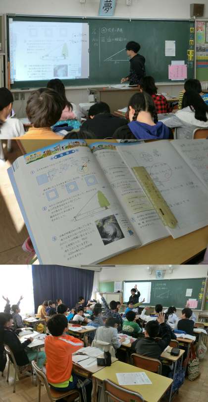 11月2日(木)、6年生の算数、かえで・もみじ・いちょう学級の道徳授業のようすです。6年生は、縮図を書いて木の高さを求める問題に取り組んでいました。かえで・もみじ・いちょう学級は、まどみちおさんの詩「朝がくると」を読んでいました。