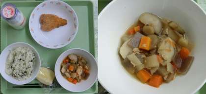 11月9日(木)、今日の給食献立は、「わかめごはん・牛乳・『ぐる煮』・ソフトカレイフライ・卓上ソース・りんご」でした。