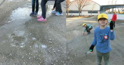 1月10日(水)、名古屋地方気象台の最低気温が度の、大変寒い朝でした。校内の日陰には、氷が張っていました。寒い一日でしたが、放課には元気な声が校庭から聞こえていました。
