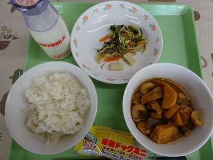 1月12日(金)の給食献立は、『麦ごはん、牛乳、煮みそ、おひたし、米粉チョコワッフル』でした。