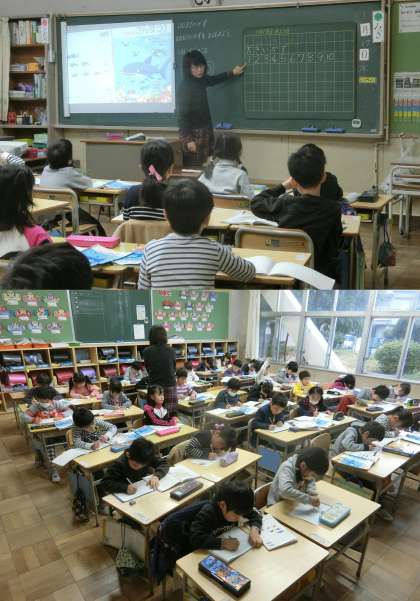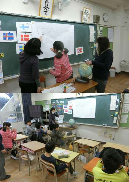 1月17日(水)、1年生の算数、かえで・もみじ・いちょう学級の社会科授業のようすです。1年生は、『大きなかず』の学習をしていました。かえで・もみじ・いちょう学級は、世界のいろいろな国の名前・場所・国旗を調べていました。