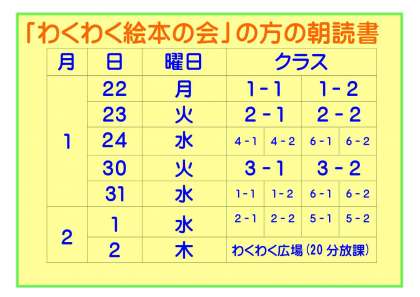 読み聞かせの見学を希望される方は、直接お子さんの教室へおいでください。読み聞かせの予定は、以下の通りです。