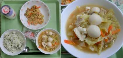 1月22日(月)、今日の給食献立は、「わかめごはん・牛乳・『豆腐とキャベツのスープ』・鶏肉のカシューナッツ炒め・りんご」でした。