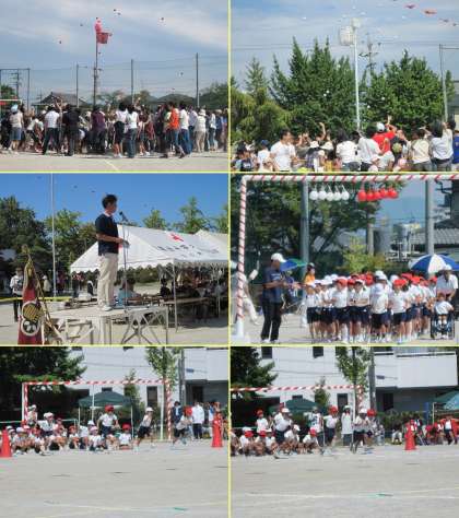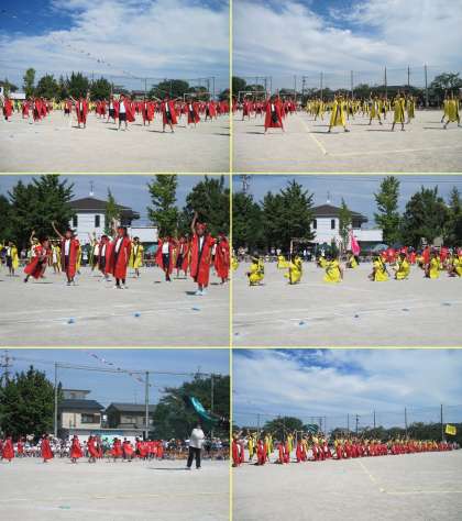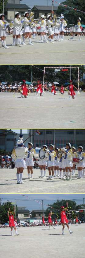 バトン・トランペット鼓隊ドリル演奏 PTA「天高き玉入れ合戦」 3・4年ダンス「どっこいせ」の様子です。