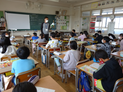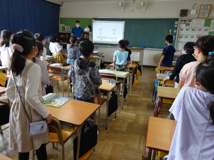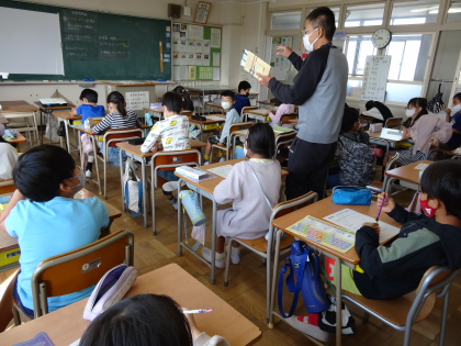 図画工作科の授業では、読書感想画の単元にはいりました。挿絵を見ずに、物語を聞いて想像力を膨らませていました。ALTによる外国語活動の時間では、好きな物をいくつかあげて、誰の好きな物か当てる「Who am I」というクイズを行いました。