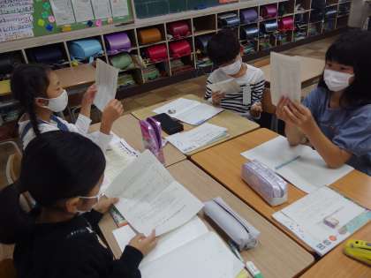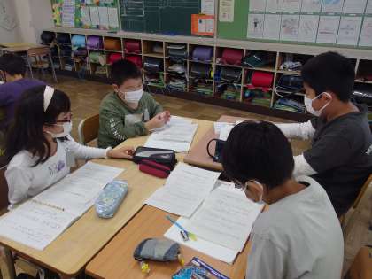 国語の時間に班で意見をまとめる話し合いをしました。自分の考えを理由とともに伝えたり、考えが出ないときは考える時間を取ったりして、学んだことを思い出しながら工夫して話し合うことができました。