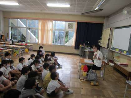 本日は、1年生と2年生で読み聞かせをしていただきました。お話の世界と自分自身を重ね合わせ、楽しくお話を聴く児童の姿が印象的でした。その1は、1年生の様子です。