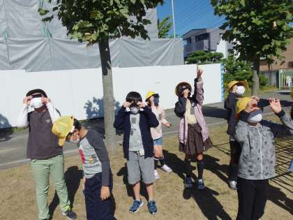 10/20 3年生その123 1組 理科の様子 公開日 2022/10/20 更新日 2022/10/20 3年生 遮光プレートを使って太陽と影の位置の関係を調べました。普段はまぶしくてはっきりと形が見えない太陽ですが、遮光プレートを使うと形や位置がはっきりわかり、子どもたちから歓声があがっていました。