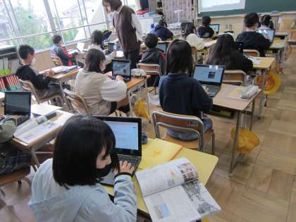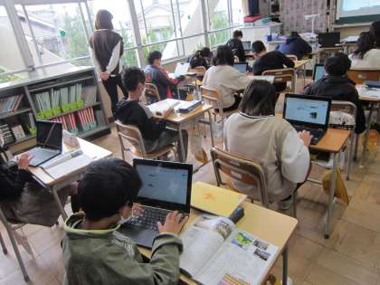 その2は、社会科の様子です。愛知県の災害について教科書を資料に調べ、Chromebookを使ってまとめているところです。