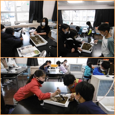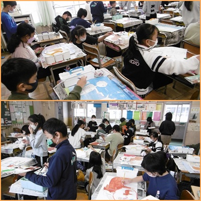 1組は理科で水の流れによって、地形が変化することを実験で学習しました。2組は図工で読書をして、その物語からイメージした事を絵に表していました。子ども一人一人の個性が絵に表れていて、見ていてとても楽しかったです。
