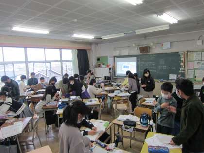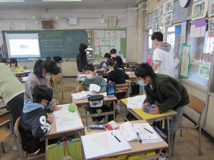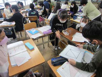 11月1日(火)5年生授業風景 その1 公開日 2022/11/01 更新日 2022/11/01 児童のようす その1は、算数の様子です。長方形と直角三角形の面積の求め方を基にして、グループごとに三角形の面積の求め方を考えまとめているところです。