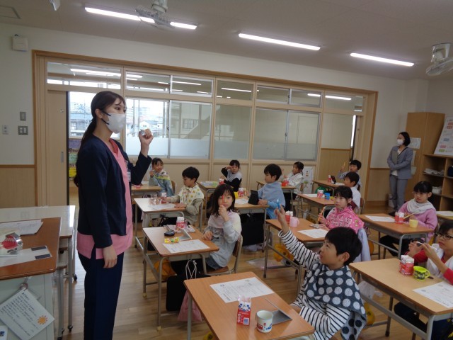 6歳臼歯や、虫歯ができる様子についてお話をしていただき、歯磨きの仕方について教えていただきました。