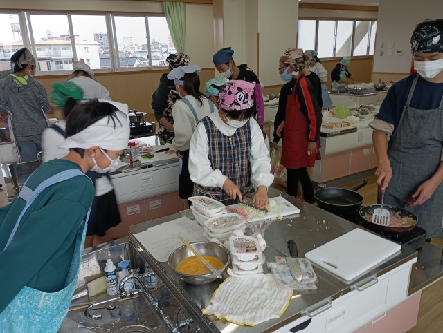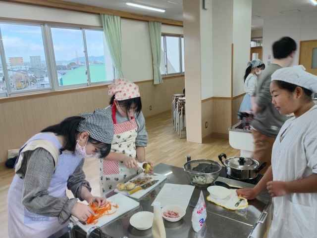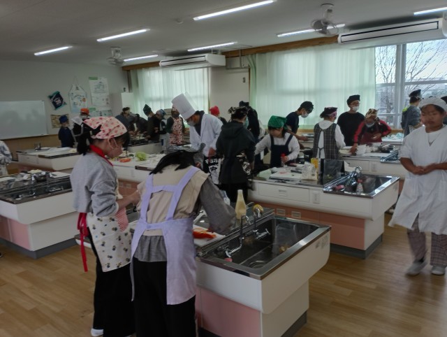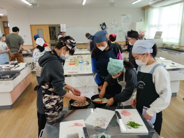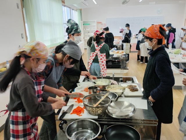 ポテトサラダや豚汁、春雨スープなど、10品にも及ぶメニューを班ごとに調理しました。
