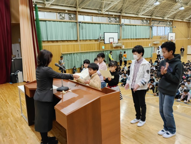 朝会で今年度後期の委員会の委員長と学級委員の認証が行われました。