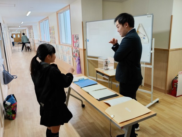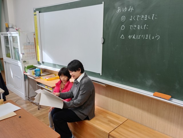 終業式が終わり、担任の先生より通知表「あゆみ」を受け取りました。