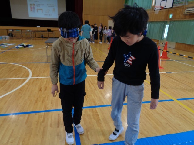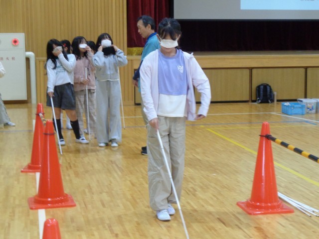 3、4時間目に総合的な学習の時間の「福祉について」の学習で、視覚障害やその方へのサポートを体験する活動を行いました。